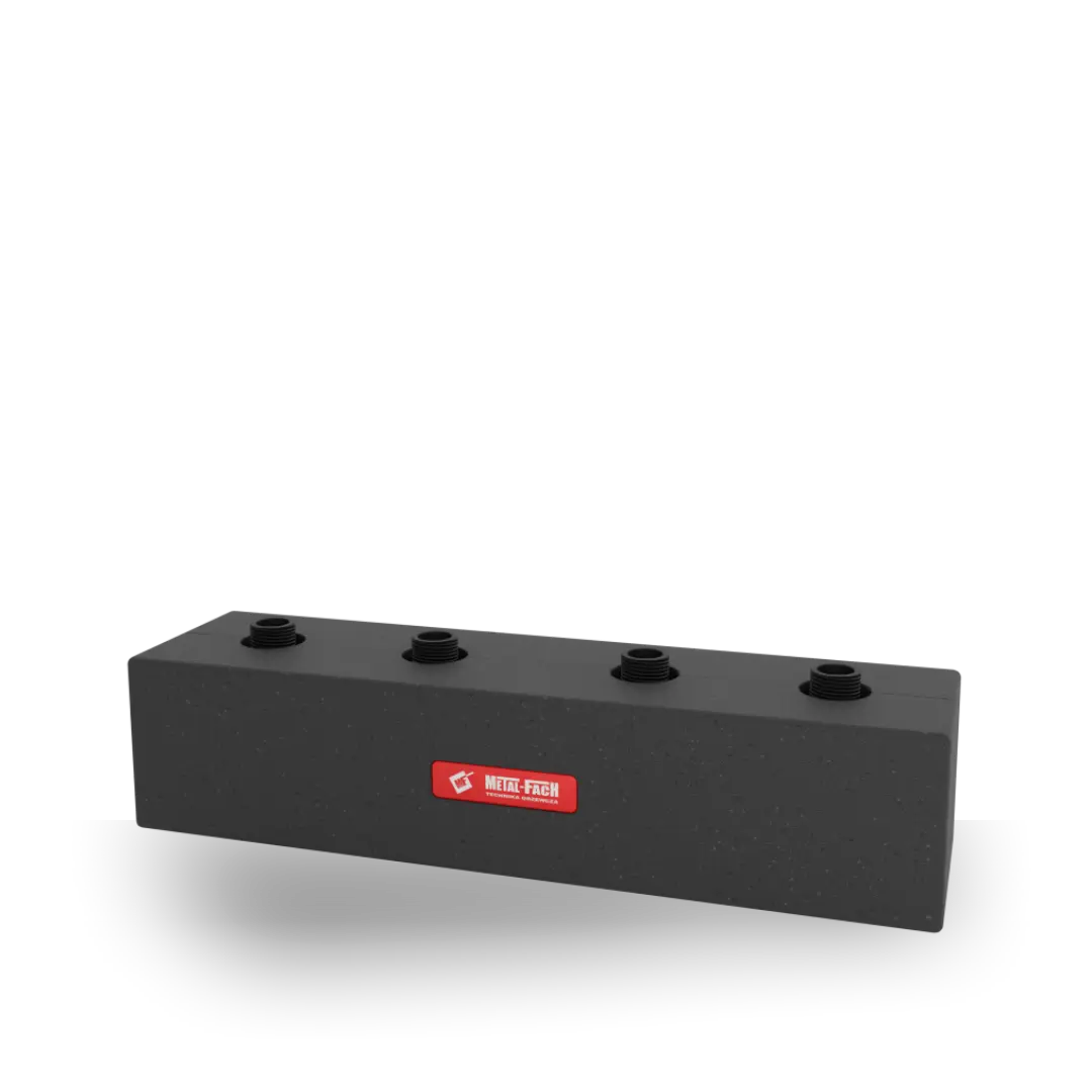 - Izolacja: EPP (ekspandowany polistyren) — zmniejsza straty ciepła w samym rozdzielaczu