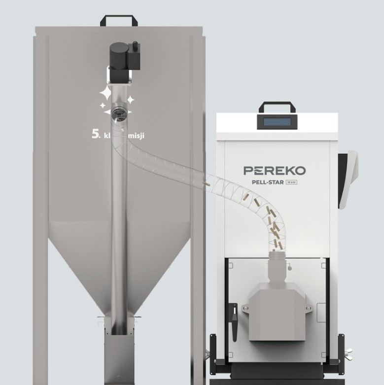 Kocioł na pellet Pereko PELL-STAR PRO pracuje na zasadzie spalania sprasowanego drewna — paliwa o wysokiej gęstości i przewidywalnych właściwościach energetycznych. Pelet z zasobnika jest automatycznie podawany do paleniska przez wciągarkę (podajnik śrubowy). Tam spala się w kontrolowanej atmosferze, generując ciepło, które przechodzi przez wymiennik ciepła do wody obiegowej instalacji grzewczej.