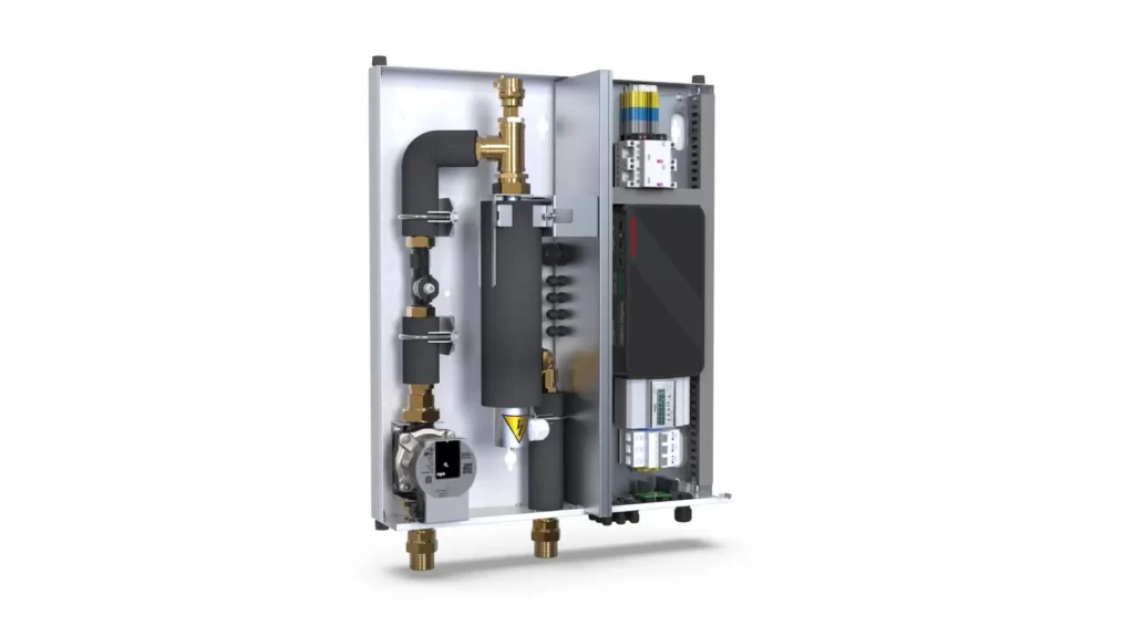 - Hydromoduł w zestawie, wyposażony w zawór przełączający do c.w.u./c.o., pompę obiegową, moduł sterujący oraz grzałkę elektryczną o mocy 6 kW, która wspomaga pracę pompy w ekstremalnie niskich temperaturach.