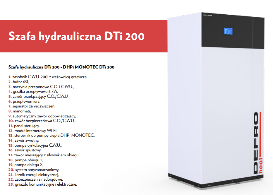 Dzięki zastosowaniu nowatorskich rozwiązań technicznych, szafa hydrauliczna wyposażona jest w dotykowy sterownik obsługujący trzy niezależne obiegi. W standardzie znajdują się dwa obiegi grzewcze (bezpośredni oraz z zaworem mieszającym), pompa cyrkulacyjna, zawór mieszający, grzałka przepływowa, licznik energii oraz zabezpieczenie nadprądowe. W celu optymalizacji miejsca w kotłowni, szafa zawiera także zbiornik C.W.U. o pojemności 200 L, bufor 65 L, dwa naczynia przeponowe oraz zawór przełączający, który automatycznie reguluje przepływ ciepłej wody między C.O. a C.W.U.. Separator zanieczyszczeń gwarantuje bezpieczne użytkowanie, chroniąc system pomiędzy jednostką zewnętrzną a DTi 200.