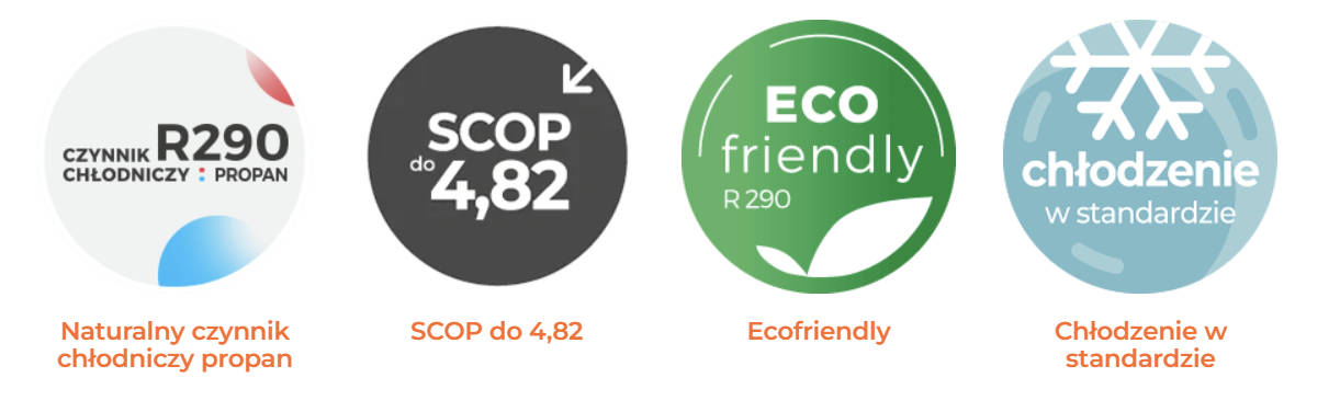 - Naturalny czynnik chłodniczy Propan R290: Ekologiczne i bezpieczne rozwiązanie o zerowym potencjale niszczenia warstwy ozonowej (ODP=0) i bardzo niskim potencjale tworzenia efektu cieplarnianego (GWP=3).